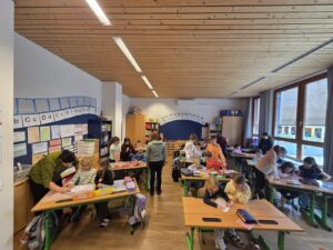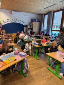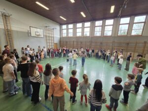 Gemeinsam starteten wir im Turnsaal, wo fröhlich gesungen und getanzt wurde. Die Kinder hatten sichtlich Freude an der Bewegung und konnten gleich erste Eindrücke vom Schulleben sammeln. Anschließend lauschten alle gespannt einer Geschichte, die für eine ruhige und gemütliche Atmosphäre sorgte.