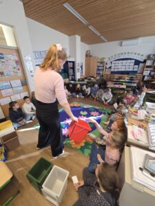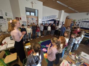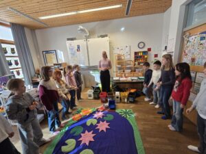 Die Projektleiterin Sabine, die uns schon seit Beginn begleitet, gestaltete auch diesmal den Workshop mit viel Engagement und Fachwissen. Mit Spielen, Experimenten und anschaulichen Beispielen lernten die Kinder, wie wichtig Mülltrennung, Recycling und Müllvermeidung sind.