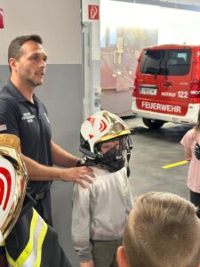 Zu Beginn führten uns die Feuerwehrmänner David und Stefan durch die Fahrzeughalle und erklärten uns die Ausrüstung. Danach zeigten sie uns die verschiedenen Fahrzeuge und die darin befindlichen Geräte. Die Kinder durften sich sogar in ein Löschfahrzeug setzen. Anschließend durften wir im Speisesaal der Feuerwehr unsere Jause essen. In der Zwischenzeit wurde die Drehleiter vor dem Feuerwehrgebäude ausgefahren. Alle Kinder trauten sich in die Höhe von 30 Meter und genossen den Ausblick über Wien.